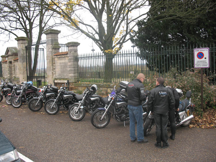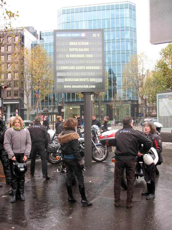 Le 16 novembre, Vmax Le Club section parisienne organisait sa dernière balade de l’année. Toujours très organisé, le club avait fait annoncer l’événement par la Mairie de Paris (merci à Yves Contassot et à Denis Baupin pour leur aide précieuse ;-)) et c’est par une température caniculaire (voir sur le panneau de la ville) et après un petit café rafraîchissant que les 10 Vmax réunis ont pu parcourir les petites routes des Yvelines (un peu boueuses par endroits quand même) en direction des bords de l’Oise.