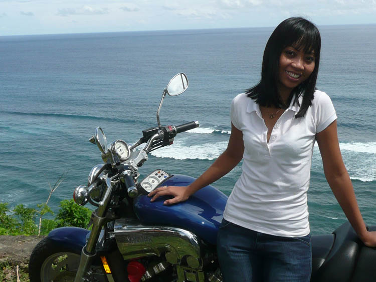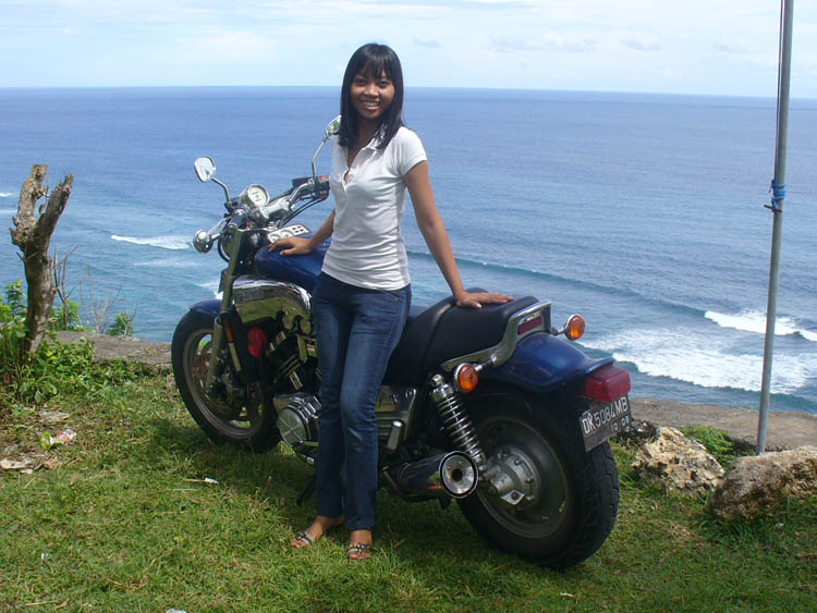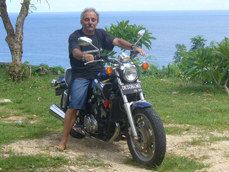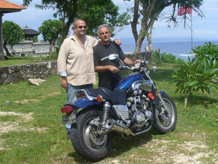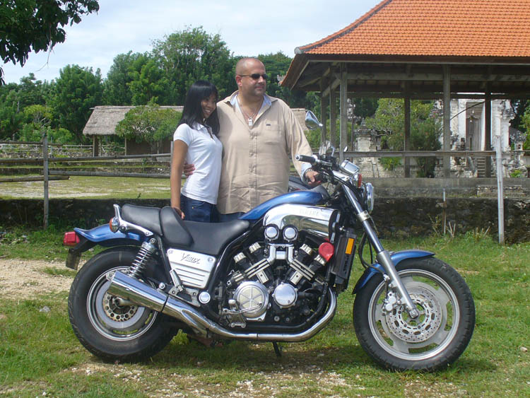 Benoît C., 38 ans (à gauche sur la photo) est sur l’île depuis plus de 10 ans avec sa compagne indonésienne Rikka. Il est de Marseille. J’ai été accueilli avec chaleur (dans tous les sens du terme) et sincérité comme savent si bien le faire les Balinais (On est très très loin de la France !). Il se fait appeler Ben car Benoît en Balinais veut dire continent : pas top pour un insulaire. Il a acheté sur l’île un Vmax 93 modèle US qu’il m’a fait essayer (ah ? le Vboost sur pas de route çà donne quoi ?). Petit à petit, il l’améliore. Après une peinture neuve, il va changer les échappements pour un pot 4 en 1 Kerker. Bonjour la galère pour l’importation de la pièce.