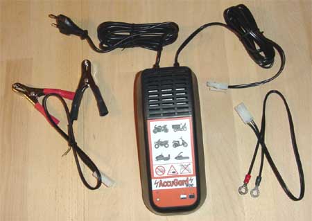 Le kit de charge que propose Denis s'appelle AccuGard et çà vient de Bruxelles. Il charge sous 0,9 A seulement ce qui fait que vous pouvez le laisser branché en permanence sans débrancher la batterie et sans enlever les bouchons. Quand c'est chargé, il s'arrête tout seul. Montez les 2 câbles sur les cosses de batterie et fixez la prise au cadre à l'autre bout de façon à pouvoir l'atteindre une fois tout remonté, par exemple sous le faux réservoir (photo plus haut).