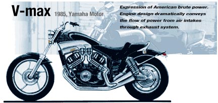 L'honorable Monsieur Araki (non il ne rit pas toujours) était le chef du projet Vmax. Auparavant, M. Araki avait été très marqué par les "Bridge races", courses d'accélération sur un pont du Mississipi. 2 motos partaient d'un côté et l'arrivée était de l'autre côté, sensiblement 400 mètres plus loin, c'est à dire la distance réglementaire des courses de dragsters (1/4 de mile). Et l'idée avait germé chez lui d'une moto surpuissante et rapide en ligne droite. Il s'enferma pendant 1 mois avec le fameux Ed Burke, alors chef du département R&D de Yamaha USA, et quelques autres, dans les bureaux de GKDI, et sortit différents croquis échelle 1 pour les présenter à la direction de Yamaha au Japon. On imagine au vu des esquisses ci-dessous que plusieurs allers et retours furent effectués entre USA et Japon avant de parvenir au dessin définitif.
