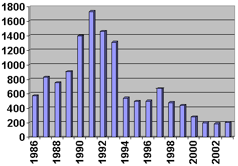1986 : 568 unités | 1987 : 832 unités | 1988 : 755 unités | 1989 : 908 unités | 1990 : 1398 unités | 1991 : 1731 unités | 1992 : 1458 unités | 1993 : 1311 unités | 1994 : 538 unités | 1995 : 494 unités | 1996 : 497 unités | 1997 : 670 unités | 1998 : 475 unités | 1999 : 438 unités | 2000 : 277 unités | 2001 : 199 unités |2002 : 186 unités |2003 : 201 unités | TOTAL 12936