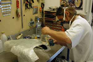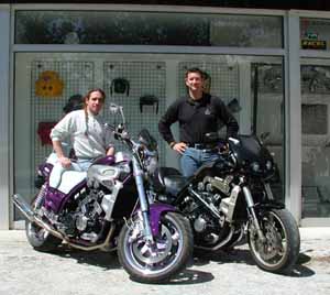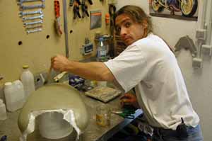 Certains d’entre vous le connaissent sûrement pour l’avoir rencontré en février 2003 au Paris Tuning Show. Après quelques informations glanées auprès des indigènes pour trouver l’adresse, me voici enfin dans la rue et au bon numéro. Le décor est planté, une grande cour, une vitrine qui arbore fièrement quelques joyaux du savoir-faire Marco et devant un Vmax qui recevra bientôt une fourche complète GSXR et un Fazer FZX qui attend fébrilement ses nouveaux guns. Marco est en pleine discution avec un propriétaire d’Hornet pour un passage de roue, je fais donc un petit tour du propriétaire en attendant. A l’intérieur, c’est un petit atelier dans lequel 2 Vmax et un XT se partagent l’espace. De ci de là des pièces en composite, des pots, des jantes et des matériaux en attente de transformation. Ha, enfin voilà Marco, je lui montre un carénage que je ne connais pas et il m’explique que c’est un capot de jet ski, en effet, la marine nationale, lui a commandé un prototype de feu avec led bleue pour poser sur les jets qui vont équiper les nageurs de combat. Bravo, mais et la moto dans tout ça ?
