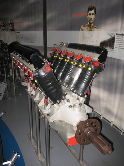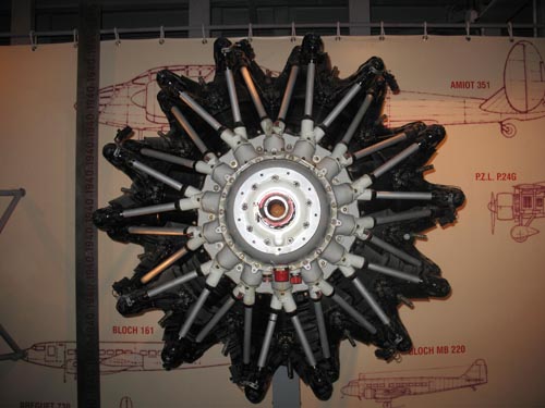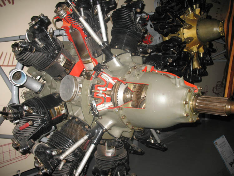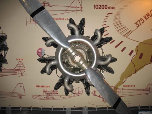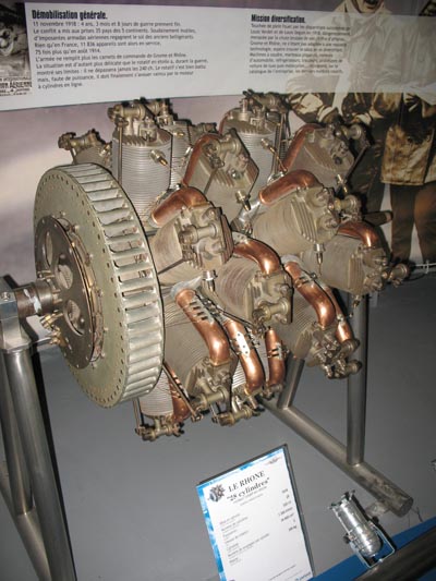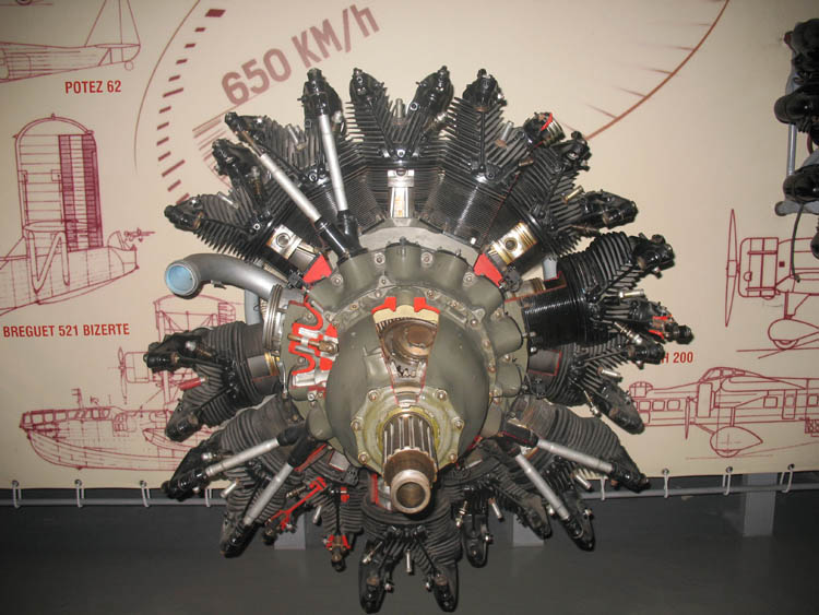 Evolution ultime du moteur en étoile, cet impressionnant « Mistral Major » de 1933 à 14 cylindres de 750 chevaux pour 570 kg était fixe grâce à l’emploi d’un réducteur qui permettait de plus hauts régimes, donc plus de puissance… Il tournait (tous les autres moteurs du musée sont en état de marche) à 2400 t/mn, consommait 250 litres d’essence et 7 litres d’huile à l’heure. Faisait quand même 38,7 litres de cylindrée, soit 2764 cm3 par cylindre !
