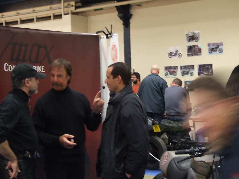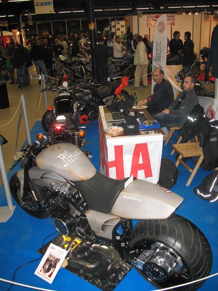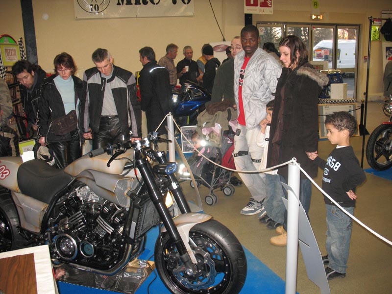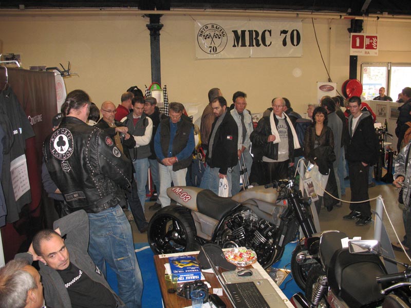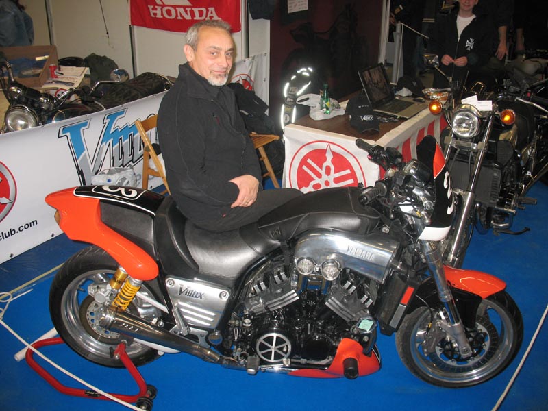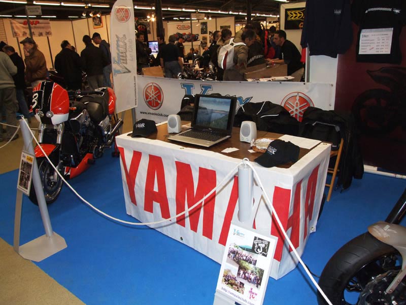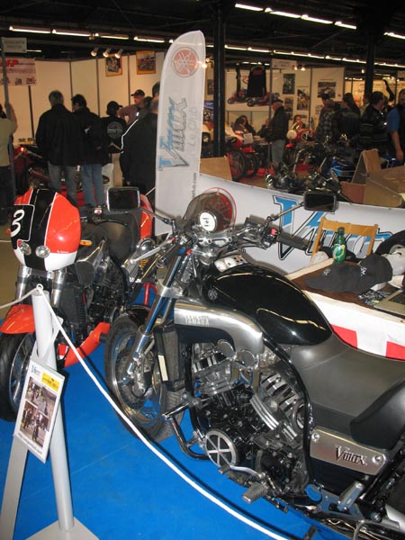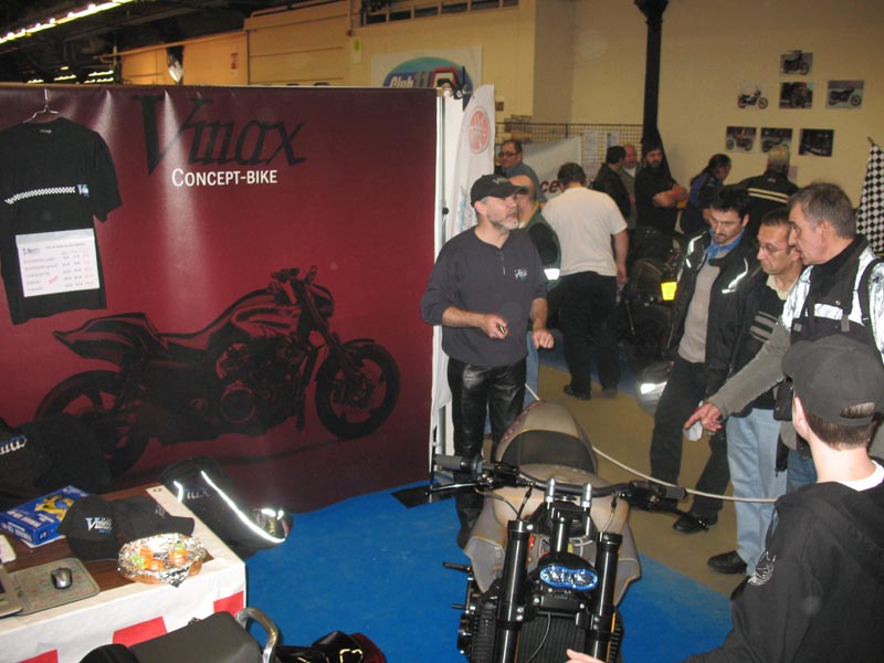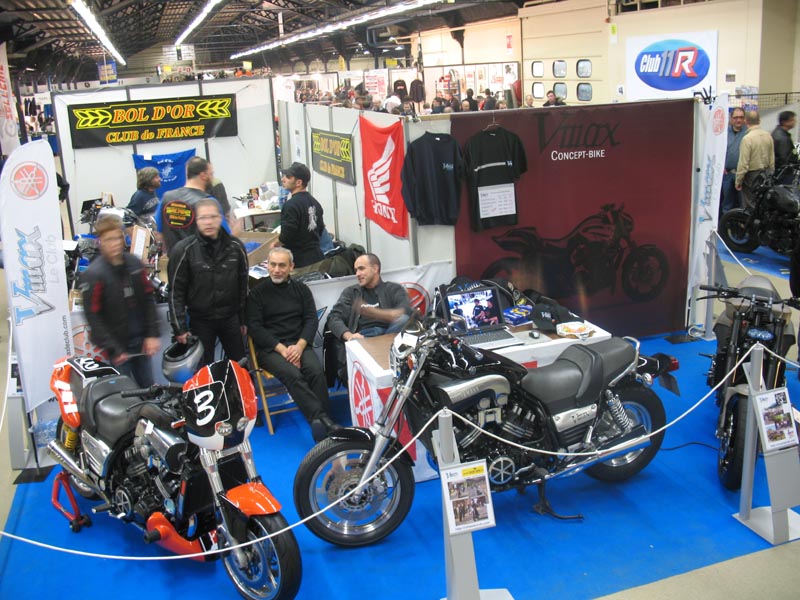 Le salon Moto Légende, c'était ce week-end et çà sentait bon le chrome, l'aluminium poli, le cuir et l'huile. Le club y a affirmé son dynamisme 2008 avec une nouvelle banderole, ses nouveaux fanions et 3 Vmax de légende : une prépa Didier Vernière qui fut une des vedettes du salon, un Vmax traité dans le style café-racer bien dans le ton du salon, et un pur collection, sur fond du nouveau concept Vmax en filigrane au fond du stand. Le Vmax, seule moto de collection qui a un futur ! De très nombreuses visites, des adhérents bien sûr, des inconditionnels du Vmax (on vous prépare un reportage sur une machine de 300 000 km du Club de l'Est), Yves Geniez (TF1), David Augugliaro (Option Organisation), Kris (KMP), Claudine (Yamaha Motor France)...