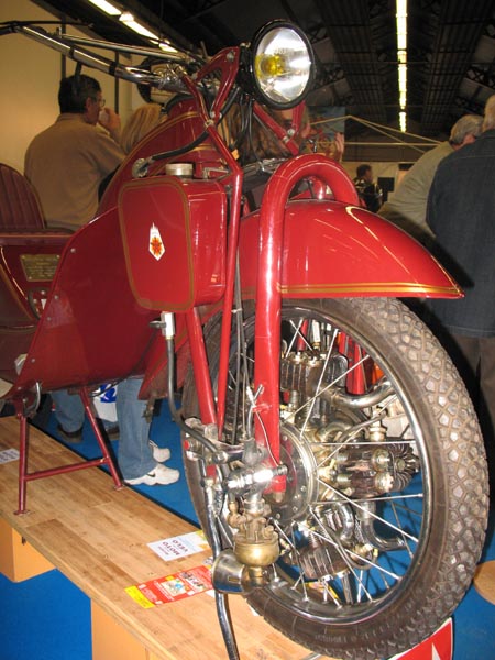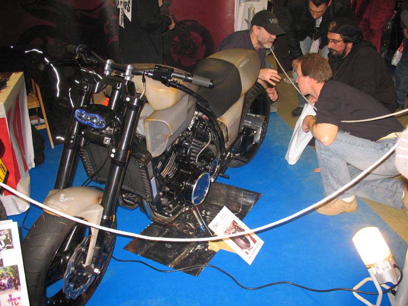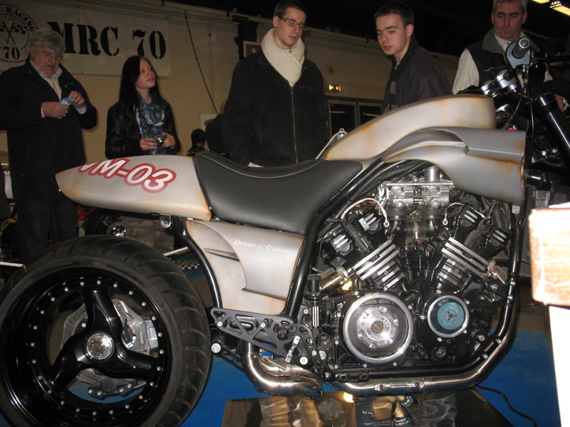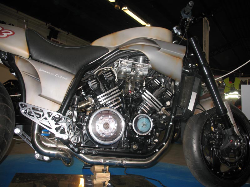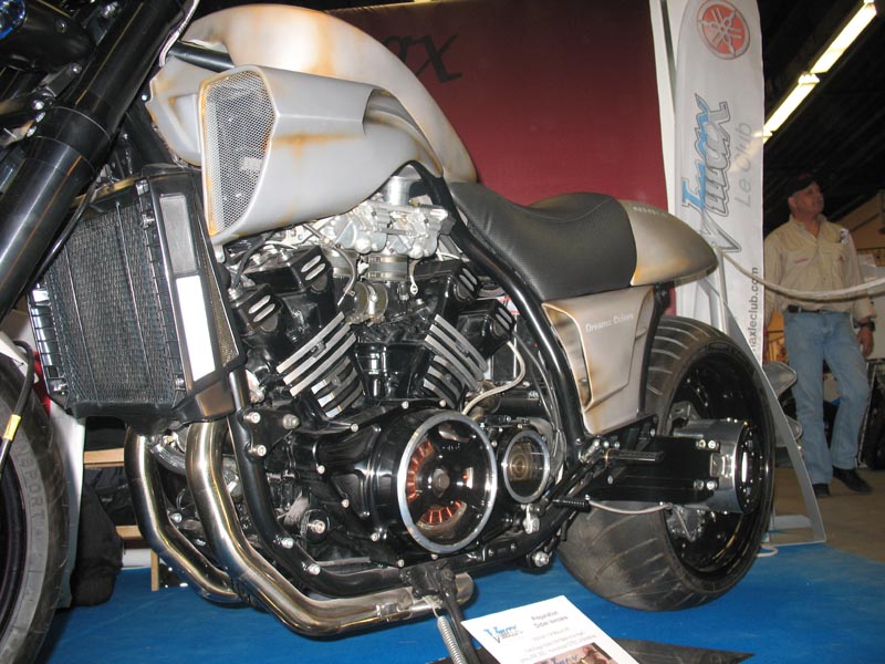 Il y avait bien sûr autre chose que du Vmax à ce salon, Patrice nous fera bientôt un reportage complet, mais si on ne devait en montrer qu'une ce serait celle là : moteur en étoile qui tourne avec la roue avant, dans le style aéronautique du début du siècle quand les moteurs tournaient avec l'hélice !