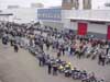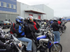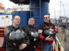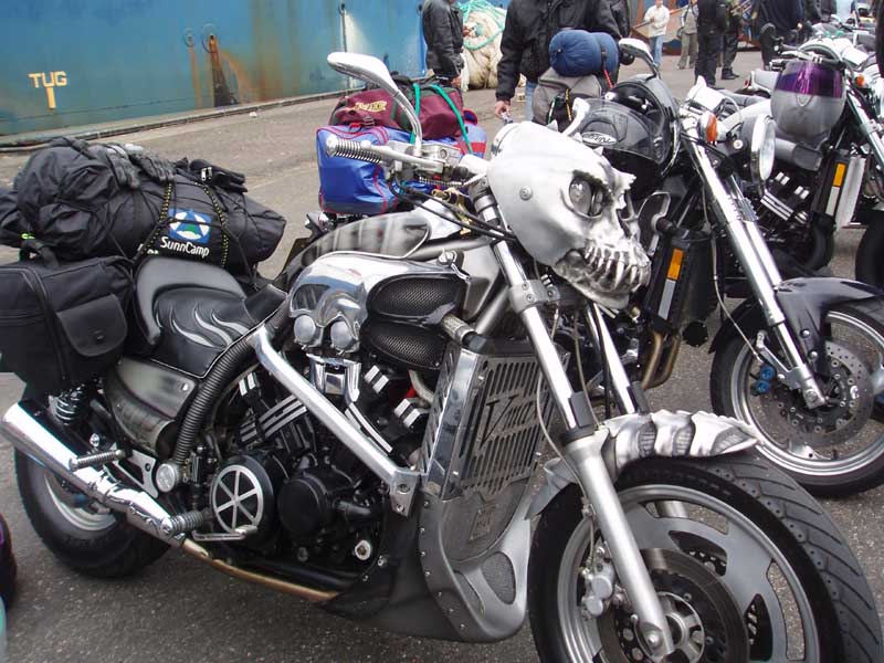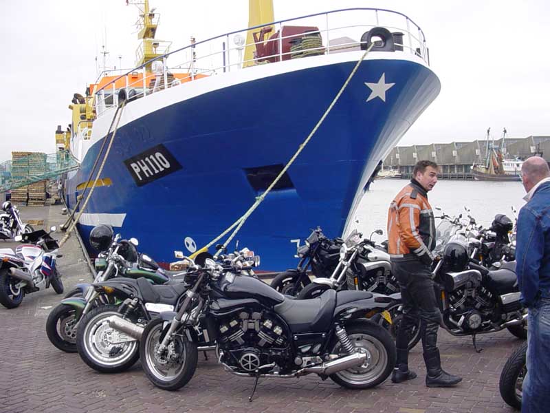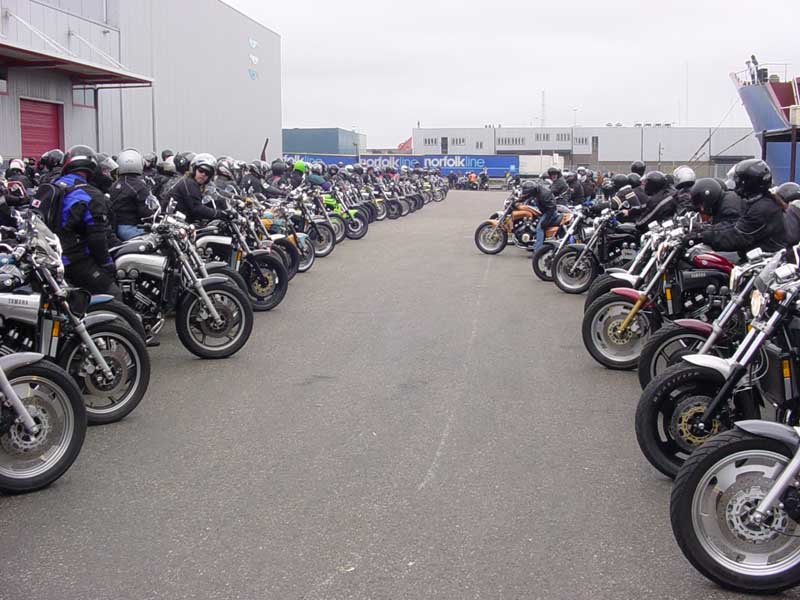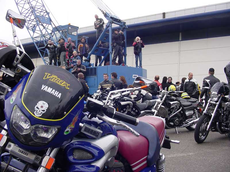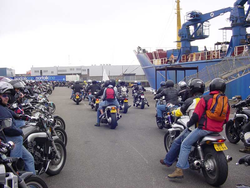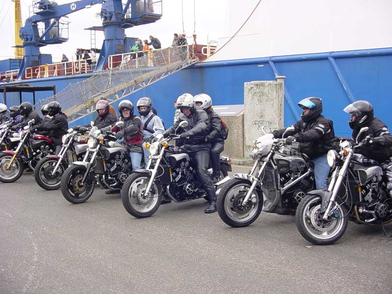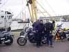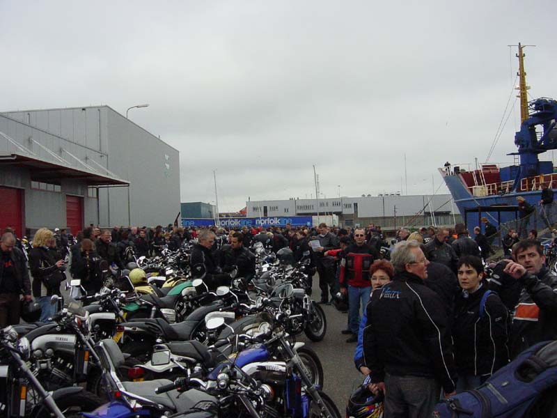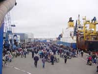| Après l'inscription, un grand moment dans le port : tout le monde est rassemblé au pied des grues et des hangars près d'un cargo et les motos sont numérotées une par une. Vue imprenable de la passerelle du bateau. | |||||