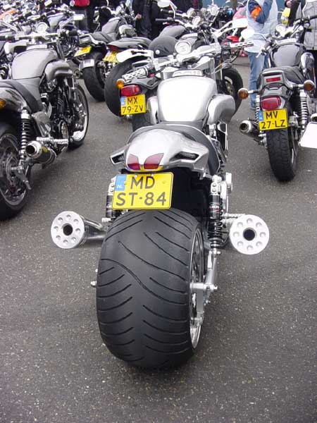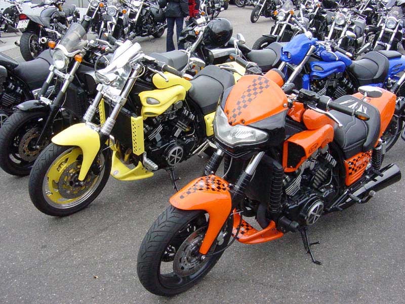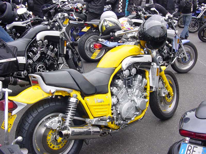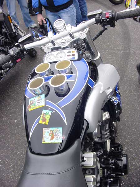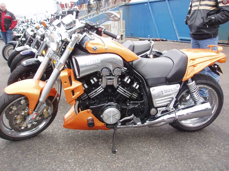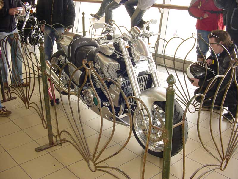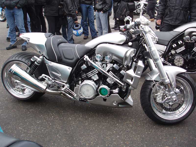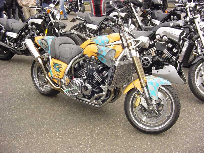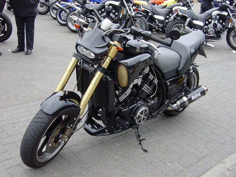 | Ce Vmax, dénommé "Stainless", a été la vedette. Pneu de 180 à l'avant, 340 à l'arrière, écopes XXL, échappements Doha mais pont d'origine. Il est pourtant d'une extraordinaire sobriété, et pourrait symboliser un ultime aboutissement du modèle actuel de notre machine préférée. Dans le Pier il a fallu le mettre en cage, mais dieu que c'est beau quand çà roule ! | |||||