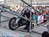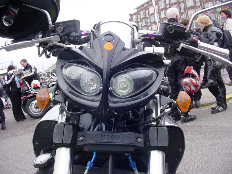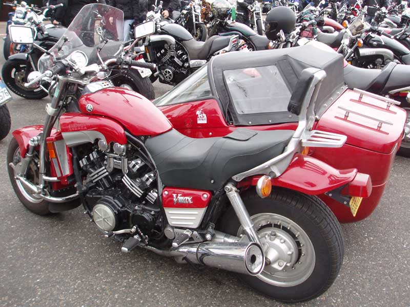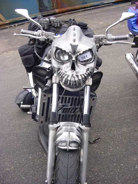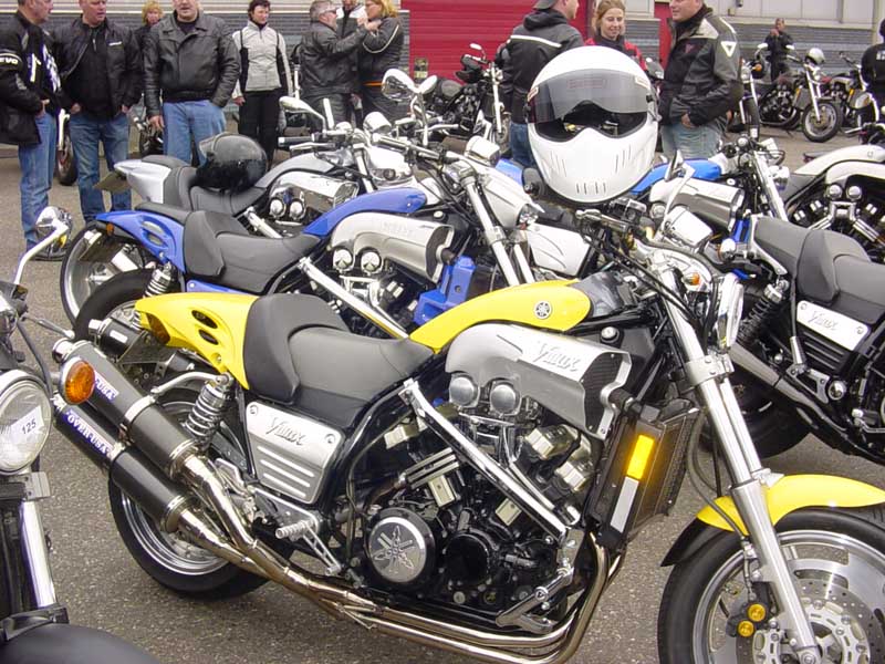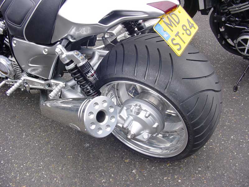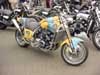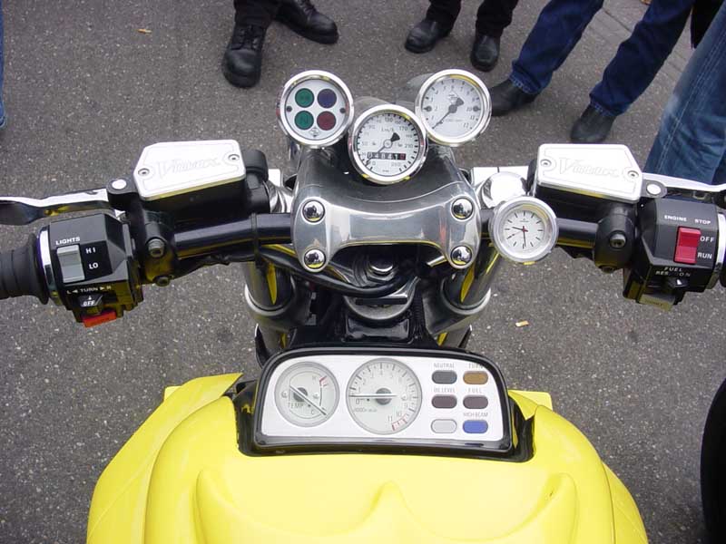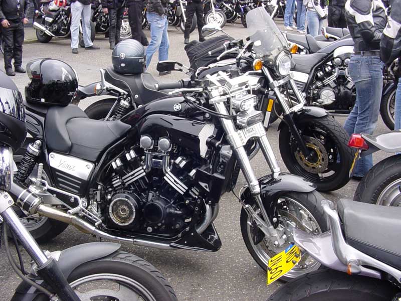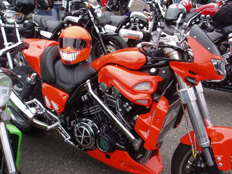 | Ce Vmax, dénommé "Stainless", a été la vedette. Pneu de 180 à l'avant, 340 à l'arrière, écopes XXL, échappements Doha mais pont d'origine. Il est pourtant d'une extraordinaire sobriété, et pourrait symboliser un ultime aboutissement du modèle actuel de notre machine préférée. Dans le Pier il a fallu le mettre en cage, mais dieu que c'est beau quand çà roule ! | |||||