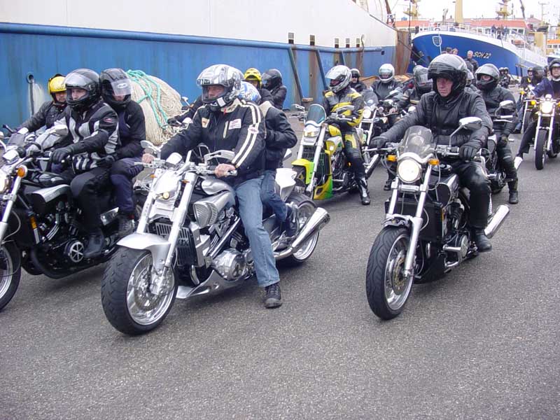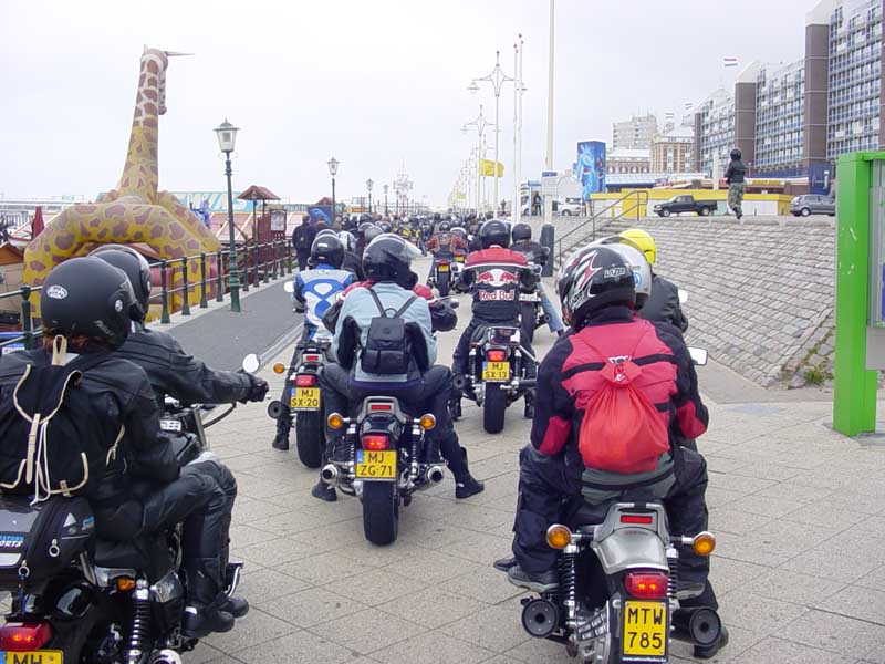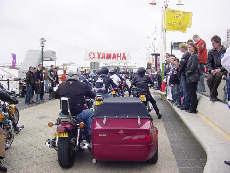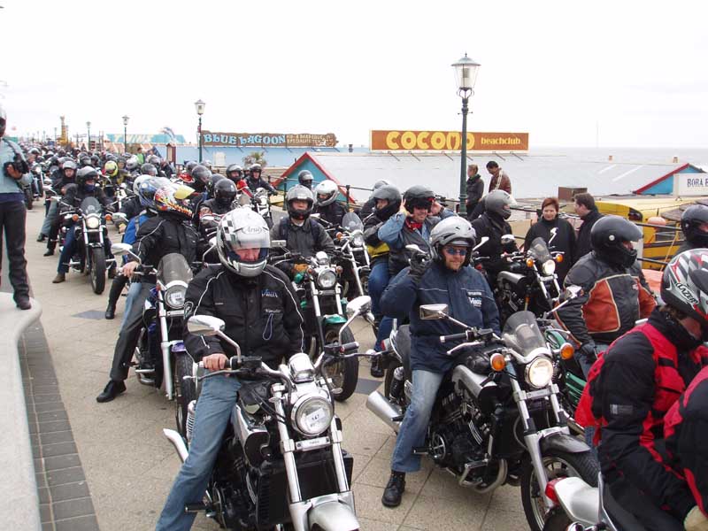 Ambiance quasi solennelle avant le top départ. Et c'est l'explosion de plus de 500 V4. Ambiance grave et rave ! Tandis que la régate mettait les voiles, le convoi s'ébranlait pour remonter lentement la promenade piétonne du bord de mer en une gigantesque parade en direction du fameux Pier. Chacun était alors photographié et autorisé ensuite à monter sur le Pier. |