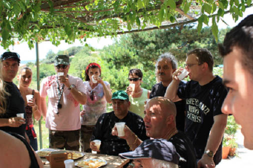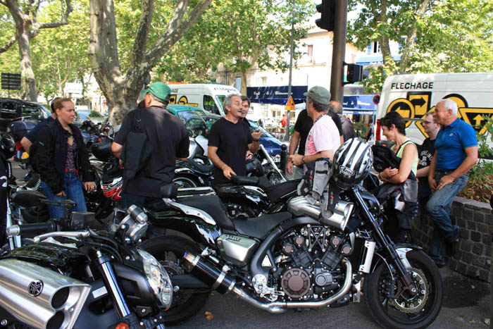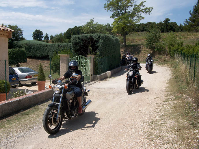 Dimanche 5 Juillet, une partie de la troupe des chudistes s’est rendue chez Pierrot84 à Rustrel dans le Vaucluse. Après un départ de Montpellier, un 1er rendez-vous à Arles où nous attend Jagmoto (Jacques) et les autres Alésiens. Une seconde étape au pays du melon (Cavaillon) pas loin de chez HCarreras (Henri) qui nous a rejoint. En tout une douzaine de motos et puis la Corvette de Jimmy. Pour pas se perdre, fallait suivre les traces de Eric le burner fou et humer les odeurs de gomme brûlée qui se répandaient devant les terrasses de café à chaque village traversé. Pratique !