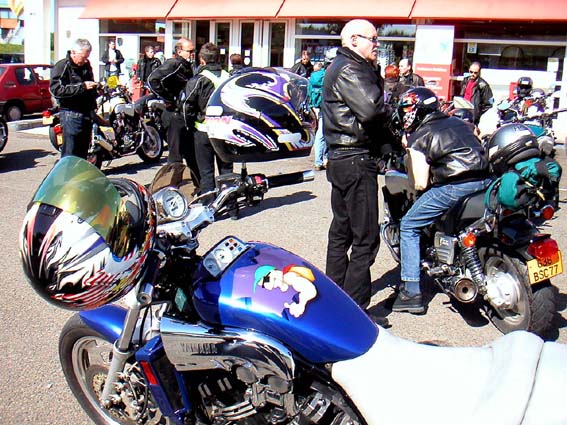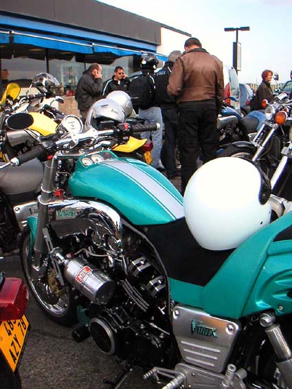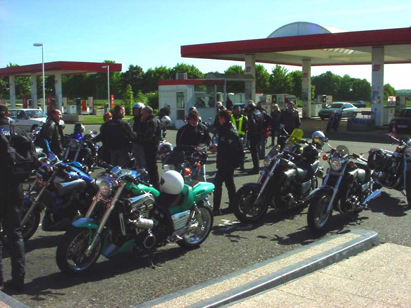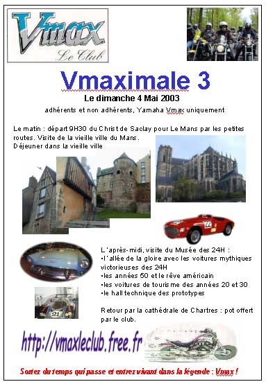 Dimanche 4 mai : les hasards du calendrier et les nombreux ponts de mai ont obligé beaucoup à sacrifier à leurs obligations familiales mais 25 vmaxistes se sont quand même retrouvés au Christ de Saclay pour une balade ensoleillée vers Le Mans organisée par votre webmaster. Et puis au club on peut rouler en famille aussi, il y a toujours une selle de libre pour emmener une personne de plus et Agnès a ainsi pu contempler les accélérations de son mari avec sa fille depuis le Vmax du webmaster. A plus de 200, ce peut être une autre forme du bonheur conjugal.