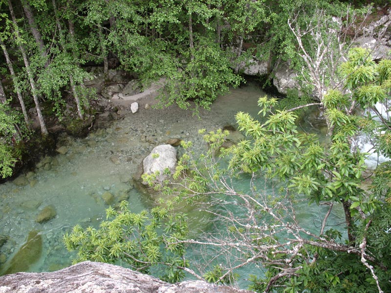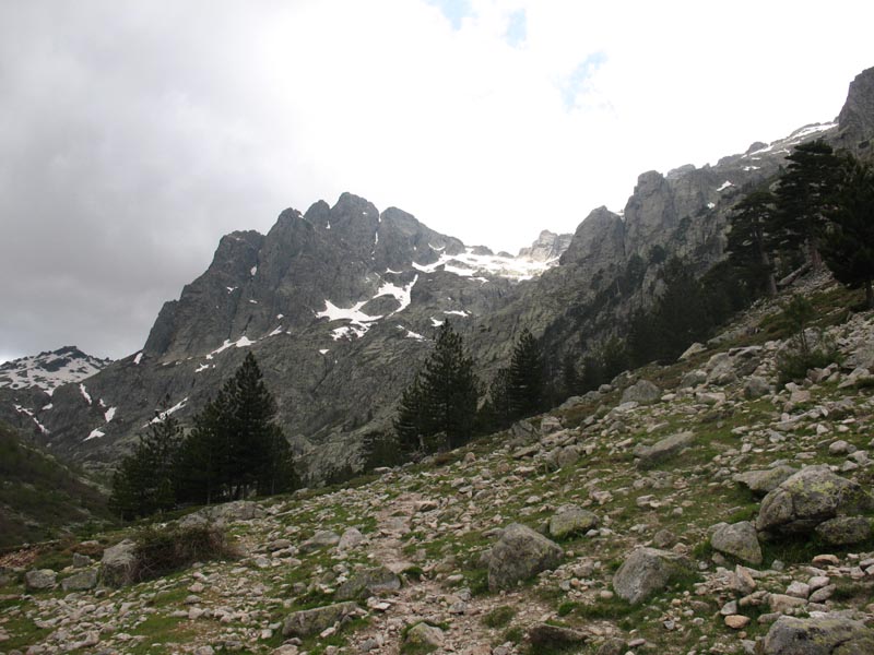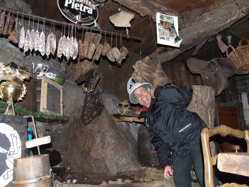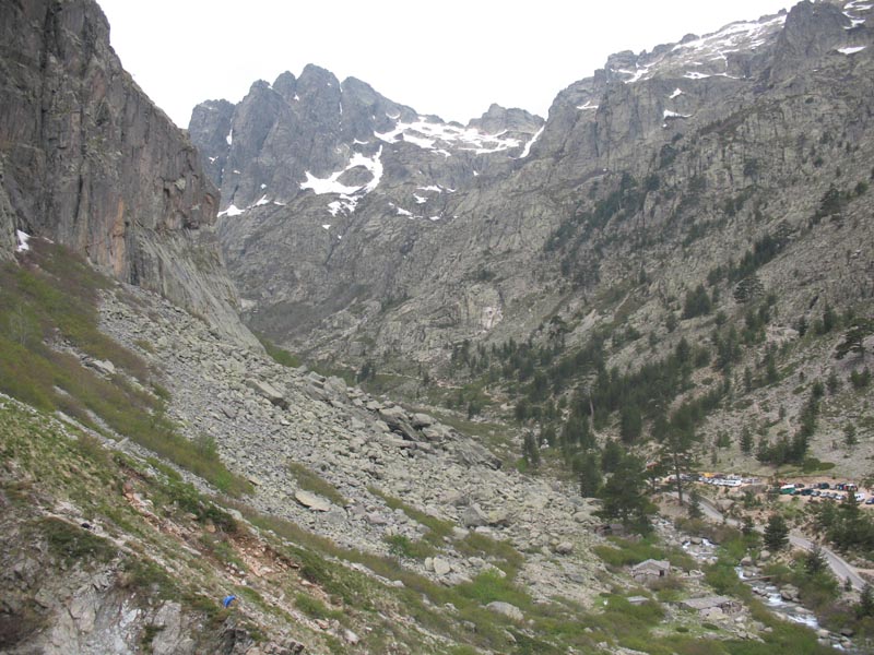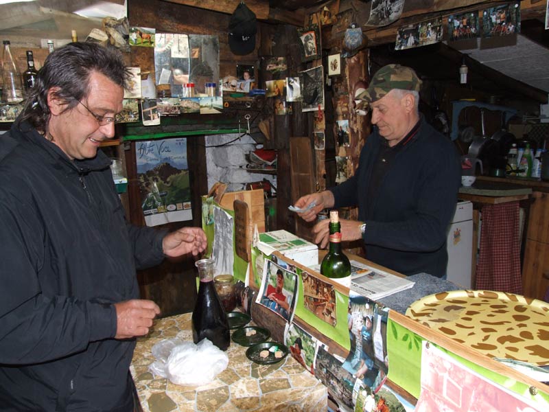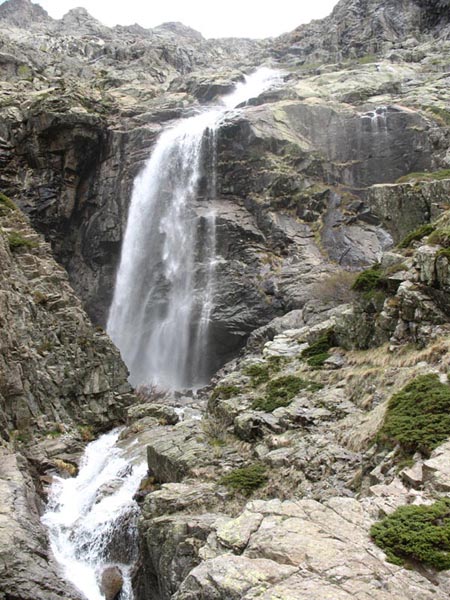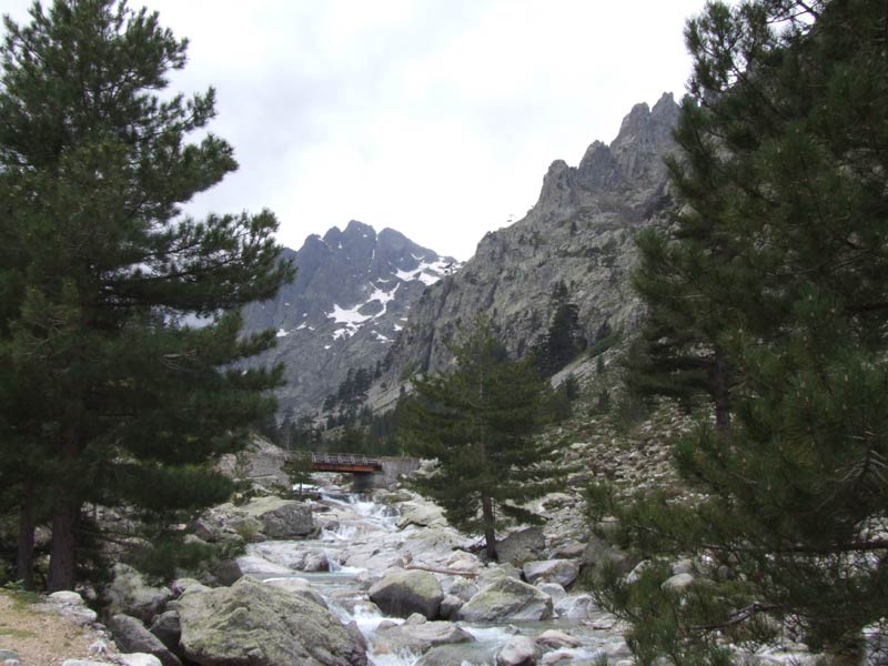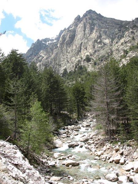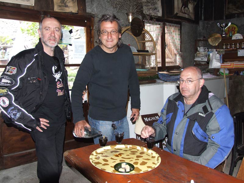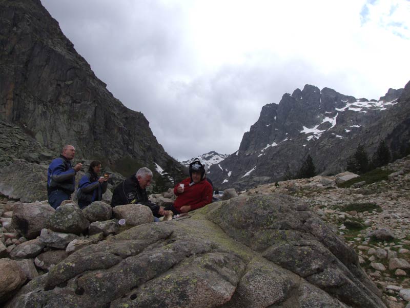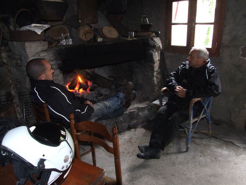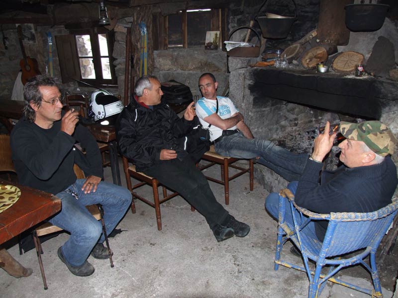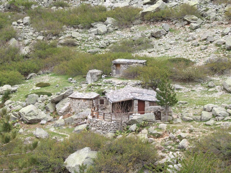 Quelques constructions basses servant de bergerie et une belle cascade que Martine et le web s’en vont escalader. Au retour, ils retrouvent le reste de la troupe dans une incroyable bergerie, au coin du feu, où l’eau courante est naturelle et descend de la montagne pour rafraîchir les cannettes, et où nous prenons un café arrosé de marc dans ce lieu chargé de souvenirs, avec un authentique berger corse.