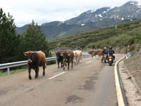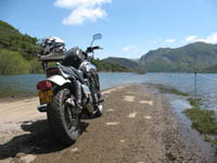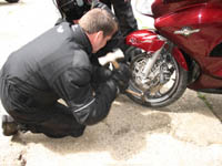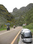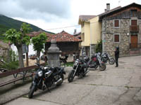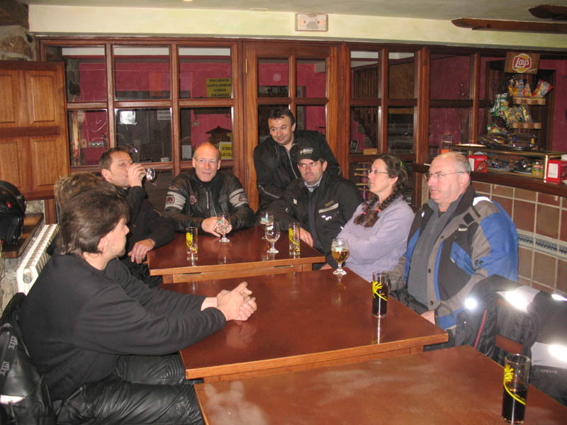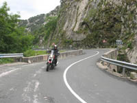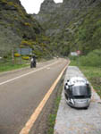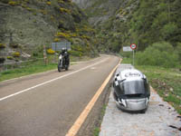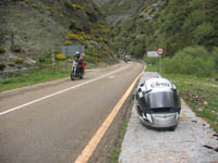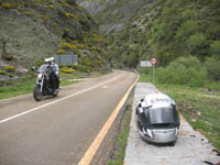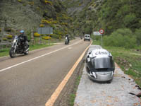 Peter a un peu oublié de tourner dans un virage en descente et s'en va abîmer sa Paneuropean contre une grosse pierre. La fourche pliée bloque la roue et le pneu est à plat. Peter n'a rien mais aussitôt le club se mobilise. Le web s'en va chercher de solides courroies dans un village proche et on redresse la fourche en attachant la moto au pied d'une glissière de sécurité et en tirant plusieurs fois en arrière. Theo redescend la moto au village et là nous essayons en vain de redonner du rond à la roue et de regonfler. La moto restera là et un plateau viendra la chercher le lendemain. |