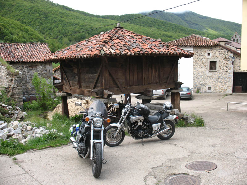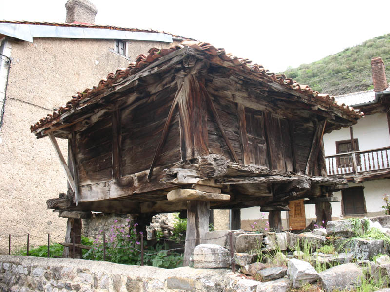 Dans ce village, c'est l'occasion de regarder un des nombreux greniers en bois typiques des Asturies. Ils sont posés en hauteur sur 4 pieds en pierre et 4 pierres larges et plates empêchent les rats de monter. |